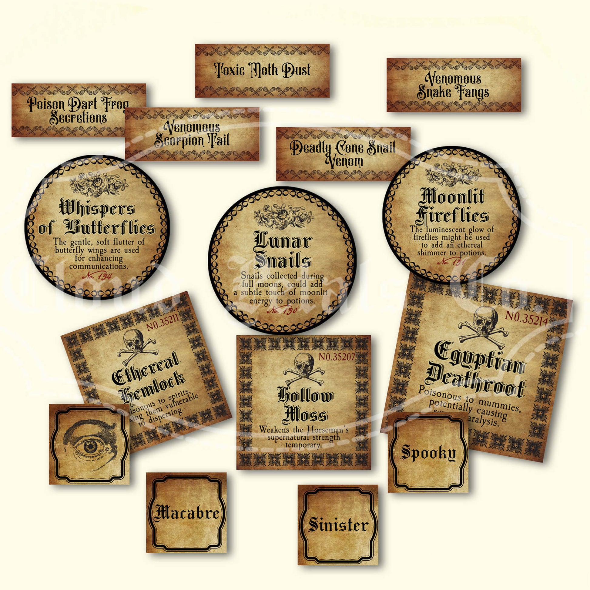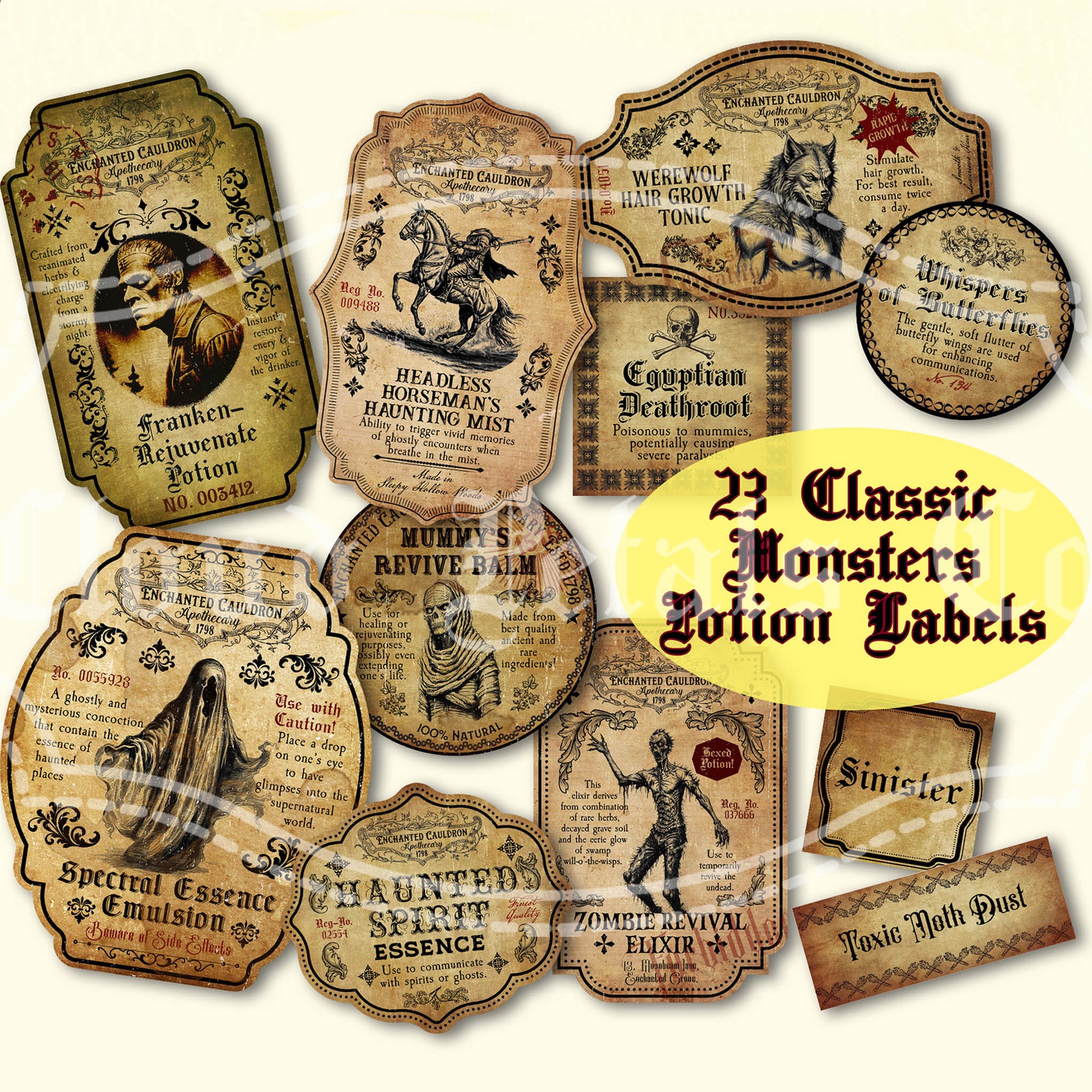 Bring legendary horror to your Halloween decor with these Classic Monster Potion Labels! Featuring iconic monsters like Frankenstein, the Headless Horseman, zombies, and werewolves, these vintage-style printables are perfect for decorating potion bottles, treat jars, party tables, and spooky craft projects. Designed with aged textures and eerie details, they're a must-have for your Halloween apothecary or haunted house setup.