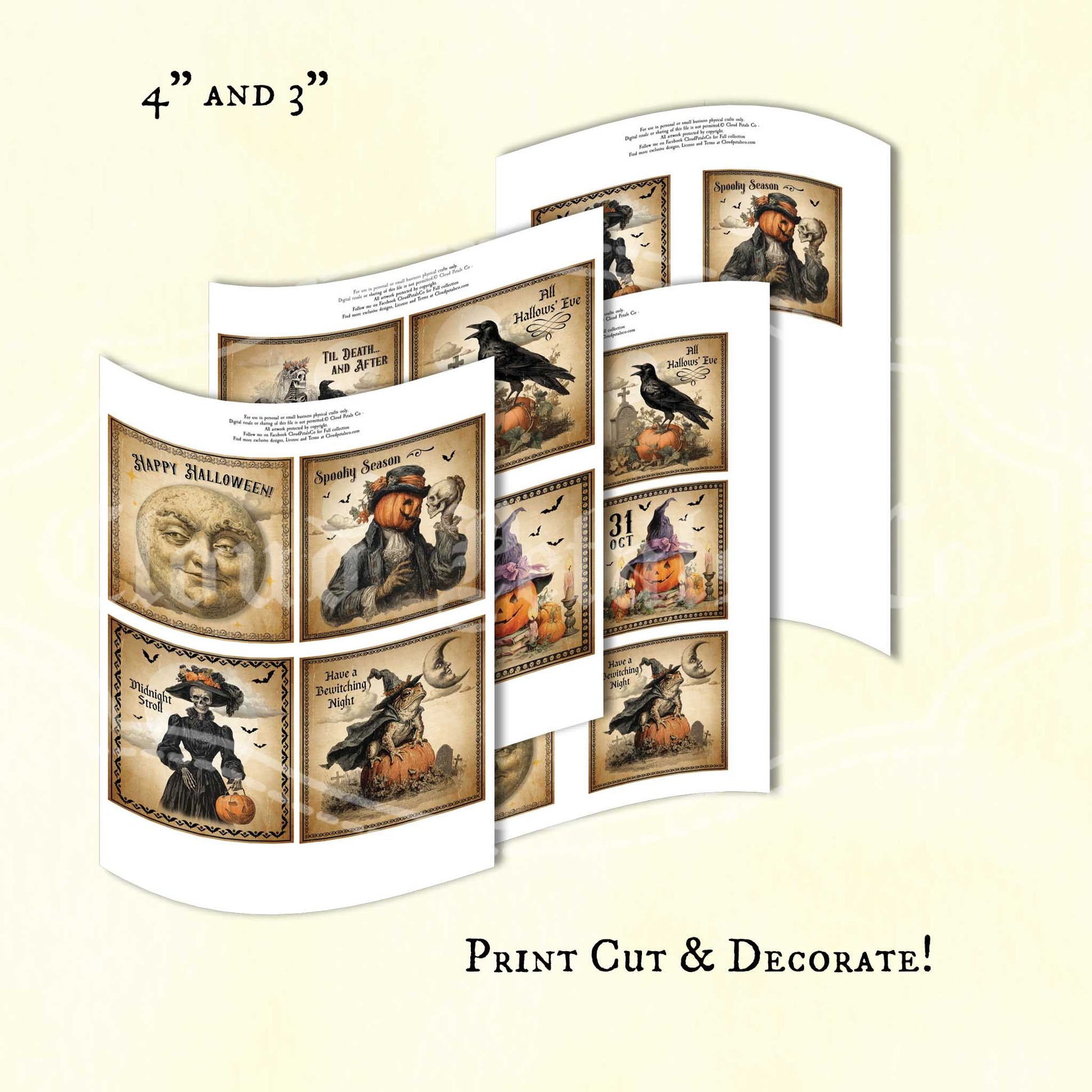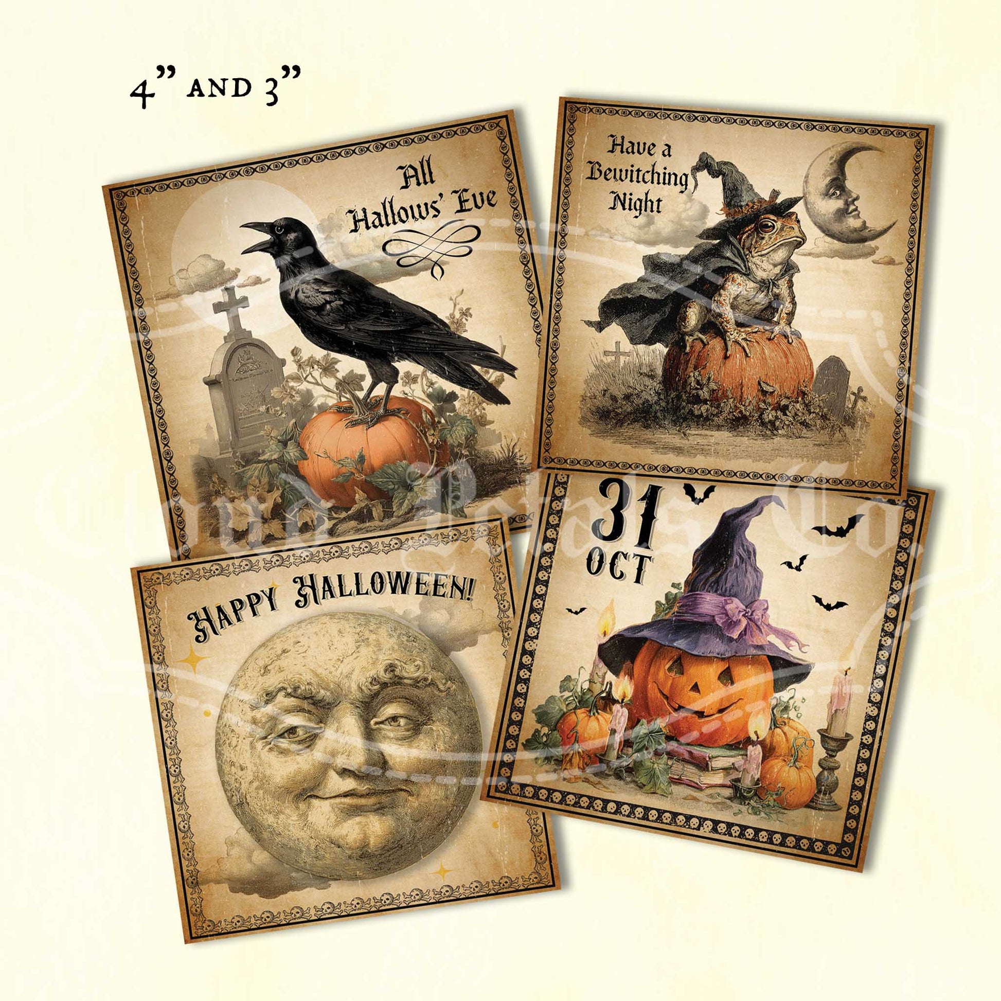 Add a spooky touch to your handmade projects with this Halloween printable image set! Perfectly sized at 3" and 4", these vintage-inspired JPEG designs are ideal for jar labels, tags, stickers, treat bags, scrapbooking, and other DIY crafts.