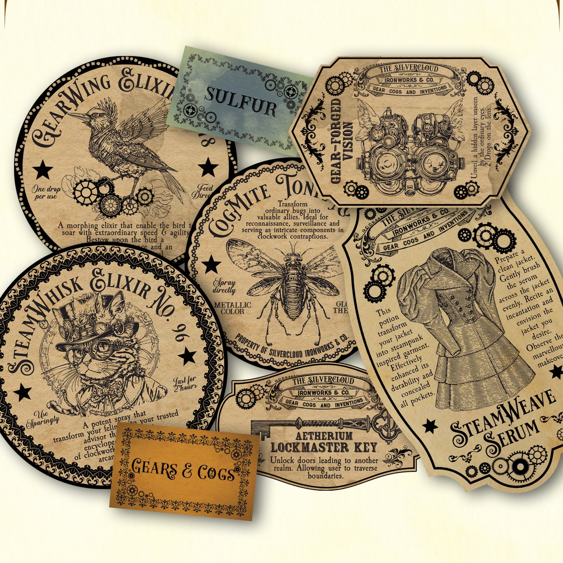 Vintage Steampunk Halloween Potion Labels – Printable Gothic Tags with Cat, Goggles, Key, Bird & Beetle