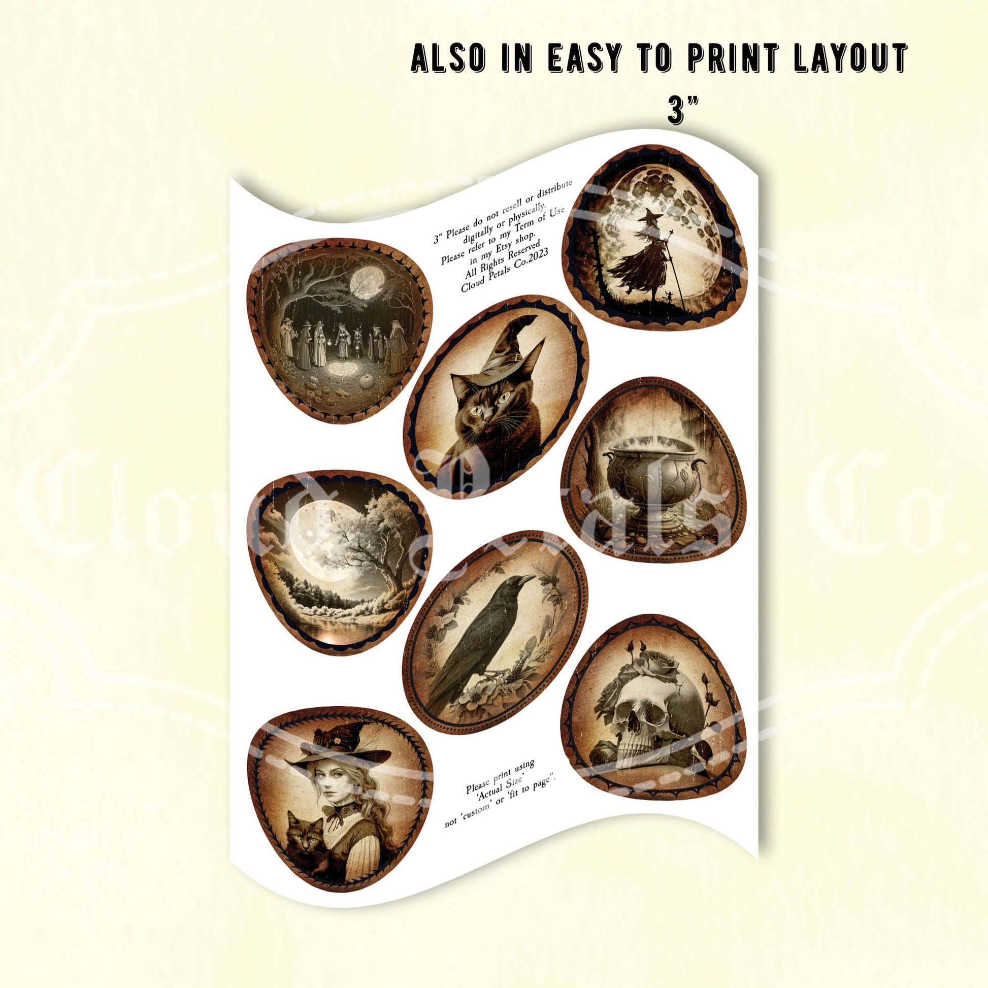 Vintage Halloween Round Labels Printable – Witch, Cat, Crow & Skull