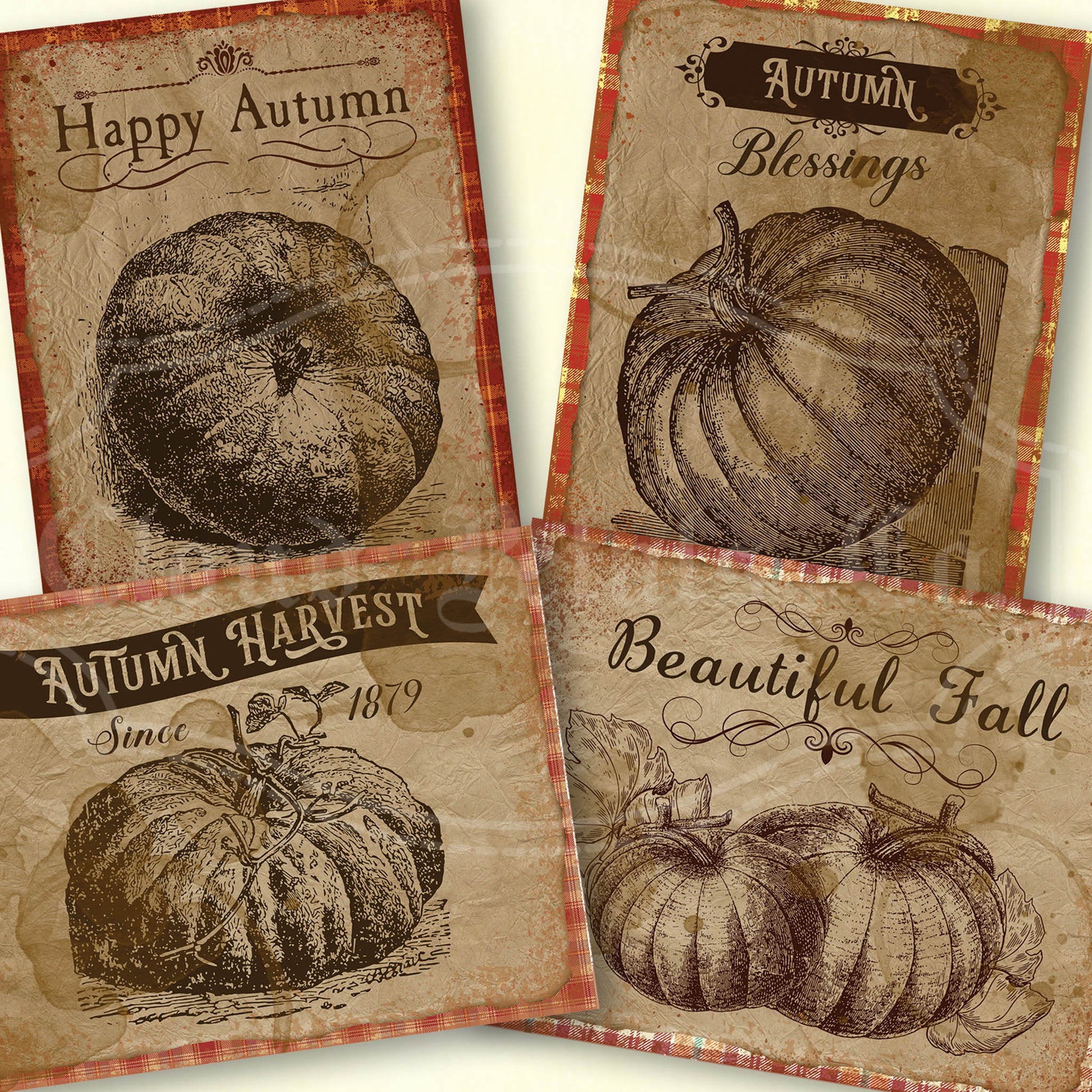 Vintage Pumpkin Labels Printable – Rustic Fall Tags with Plaid Background